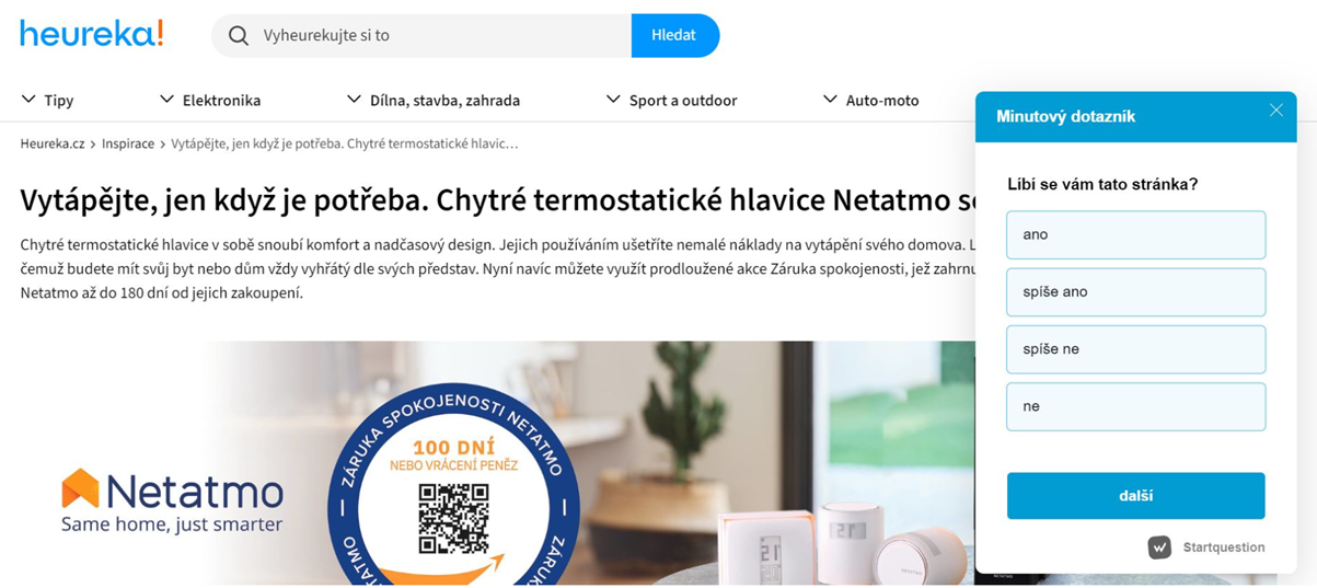 Výzkumy provádíme pomocí vyskakovacích oken (widgetů) nazvaných jako „Minutový dotazník“ v pravém dolním rohu obrazovky (viz foto)
