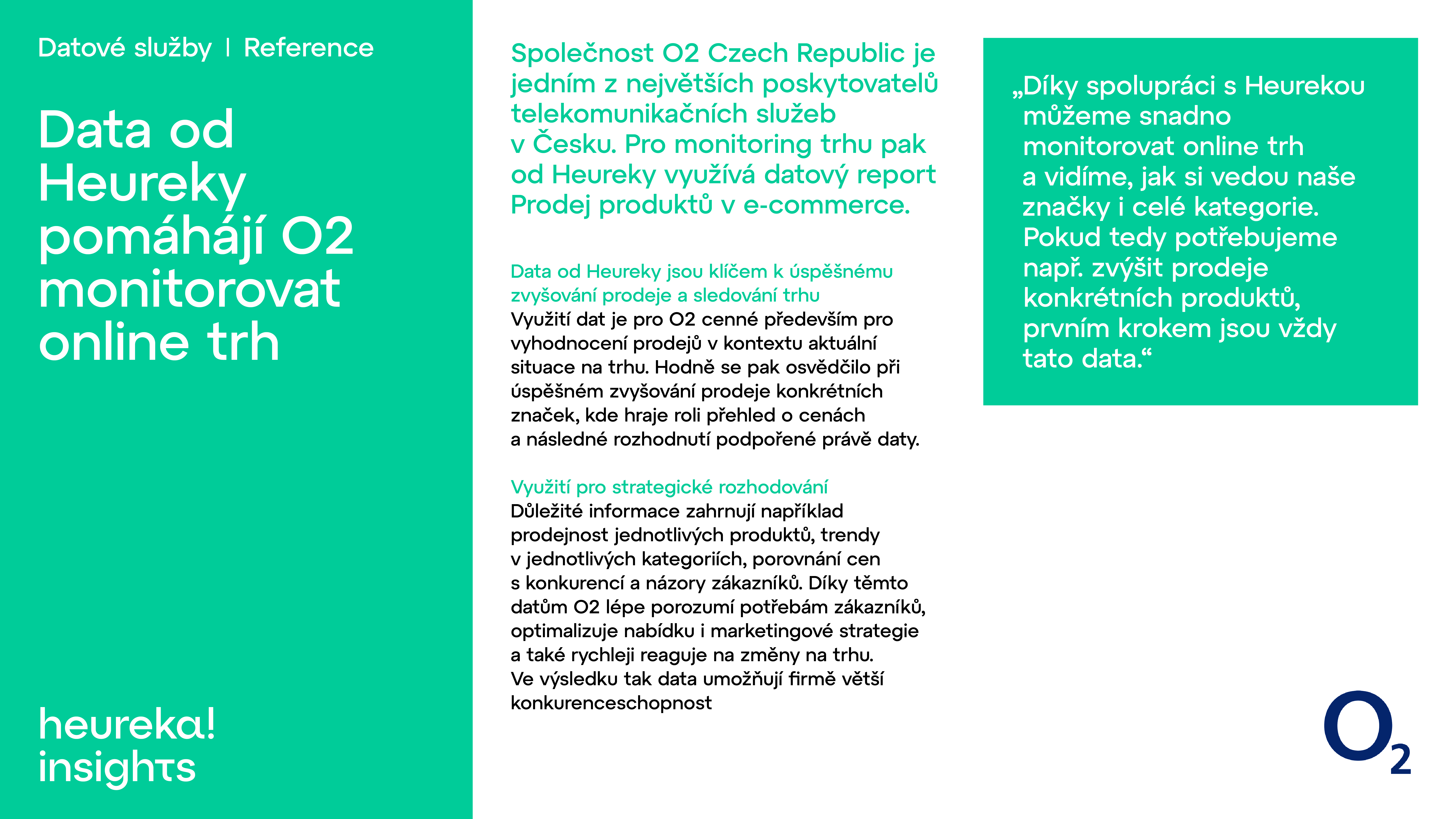 Společnost O2 Czech Republic je jedním z největších poskytovatelů telekomunikačních služeb v Česku. Pro monitoring trhu pak od Heureky využívá datový report Prodej produktů v e-commerce.