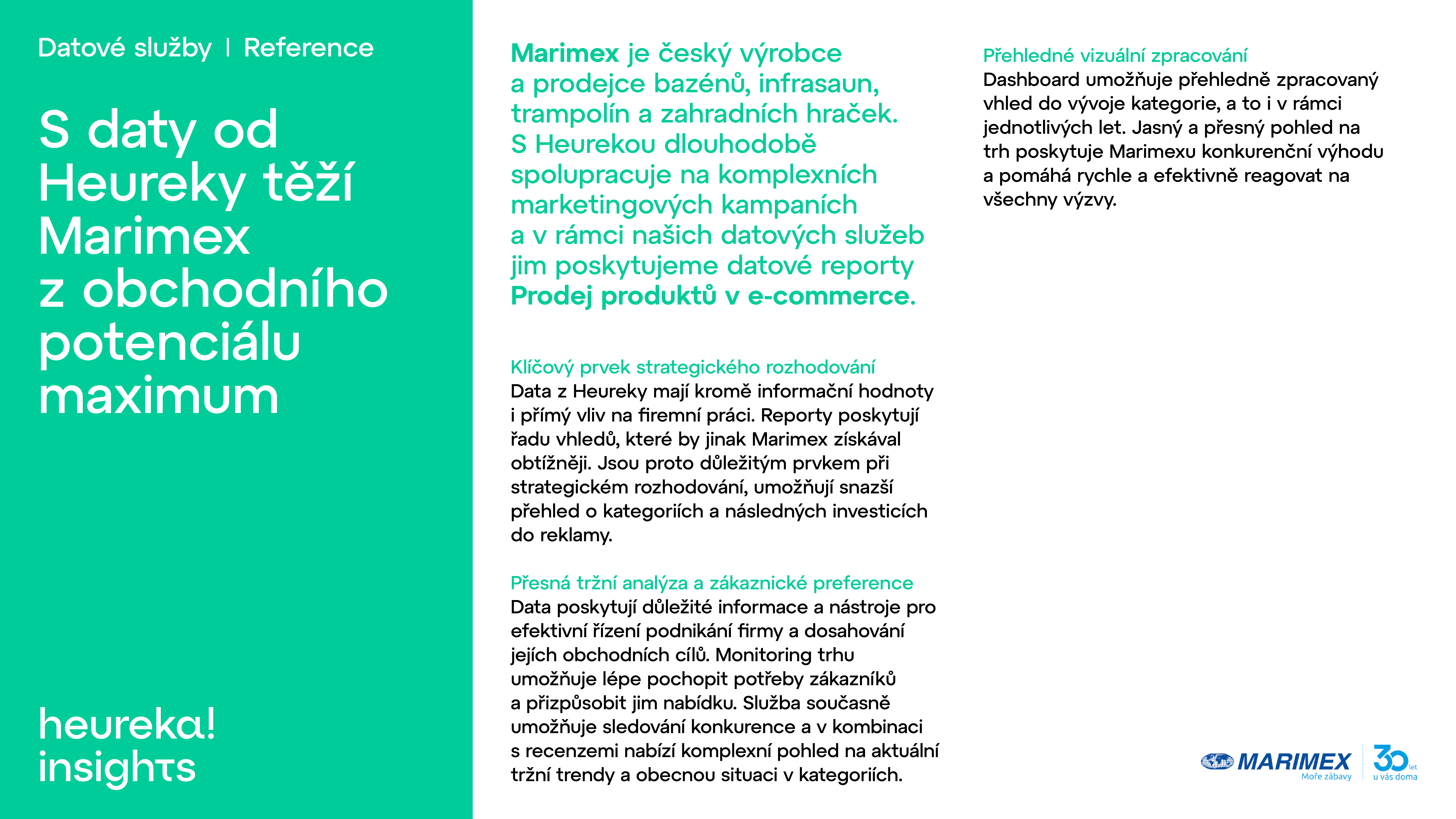 Marimex je český výrobce a prodejce bazénů, infrasaun, trampolín a zahradních hraček. S Heurekou dlouhodobě spolupracuje na komplexních marketingových kampaních a v rámci našich datových služeb jim poskytujeme datové reporty Prodej produktů v e-commerce.