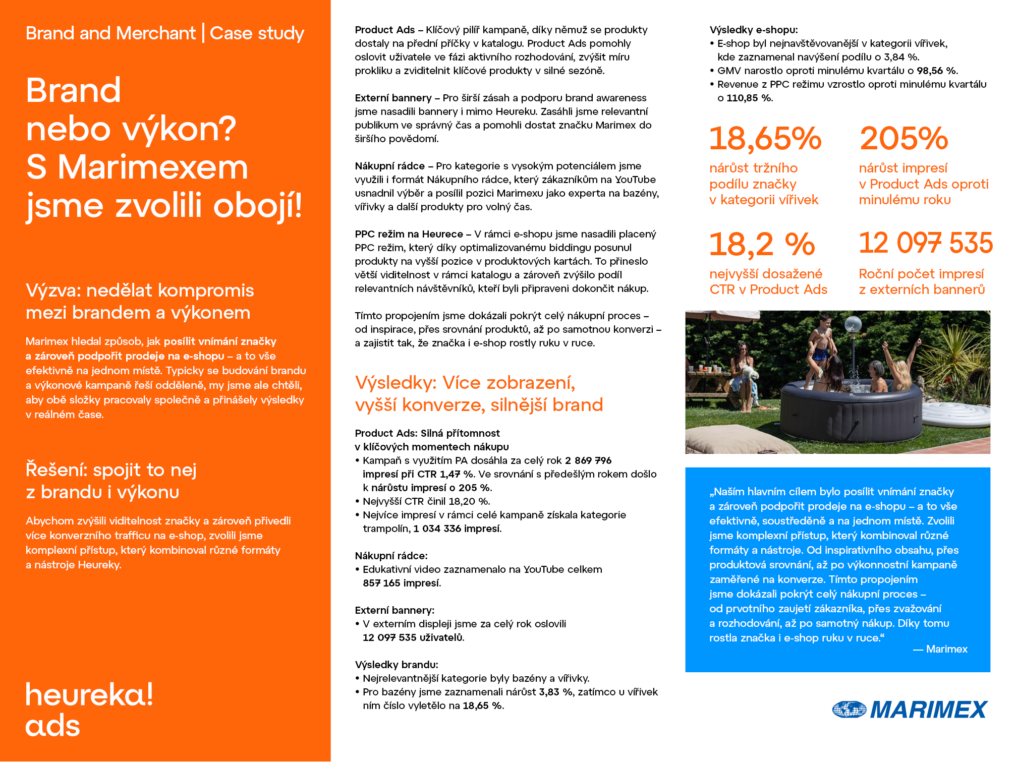 Propojení brandových a výkonnostních kampaní přineslo Marimexu 18,65% nárůst tržního podílu ve vířivkách a o 205 % více impresí v Product Ads. Zjistěte, jak se podařilo posílit značku i výkon e-shopu najednou!