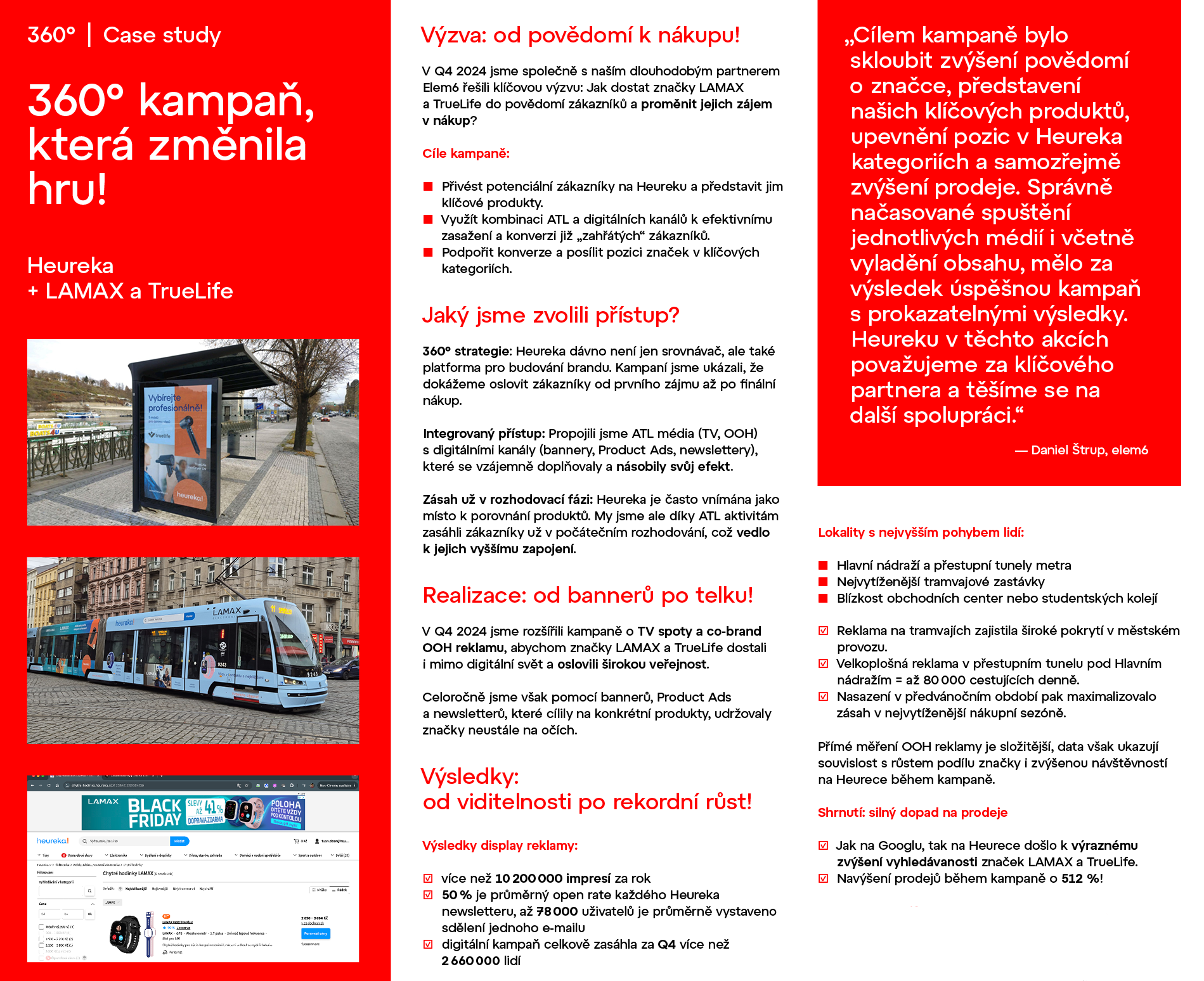 Zvýšení podílu značky o 12,2 % oproti předchozímu roku, zásadní zvýšení návštěvnosti produktové karty i počet odchodů do e-shopu. Jak Heureka docílala těchto čísel? Přečtěte si novou případovou studii a dozvíte se, jak se správně mířenou kampaní dosáhnete parádních výsledků.