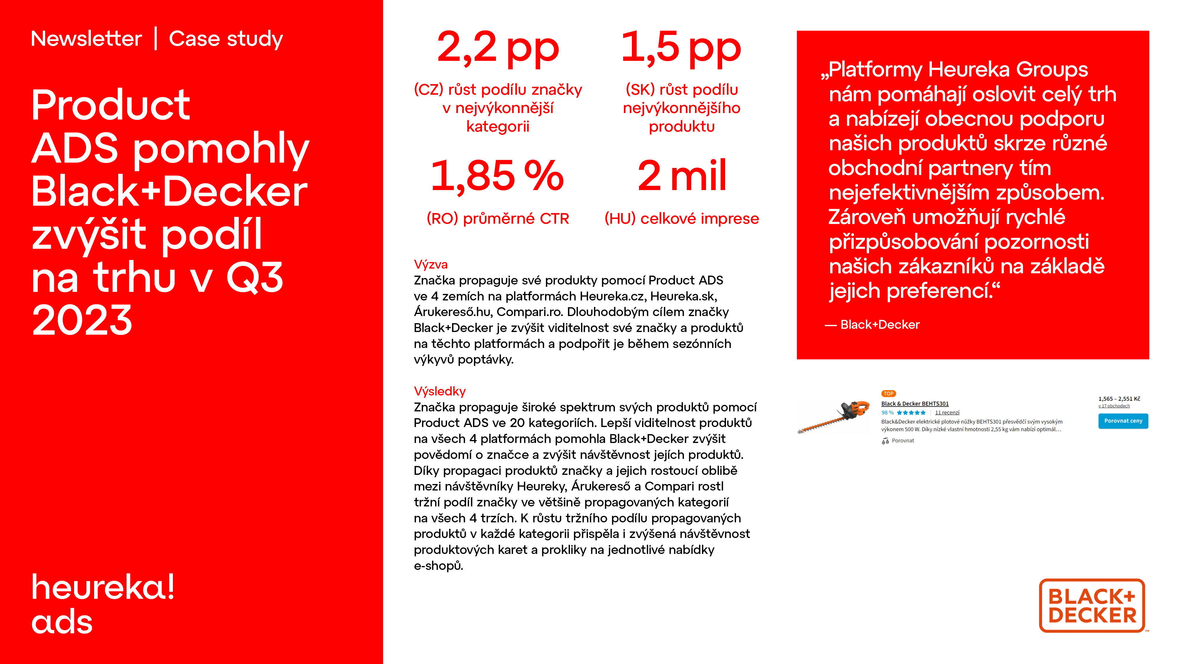 Značka propaguje své produkty pomocí Product ADS ve 4 zemích na platformách Heureka.cz, Heureka.sk, Árukereső.hu, Compari.ro. Dlouhodobým cílem značky Black+Decker je zvýšit viditelnost své značky a produktů na těchto platformách a podpořit je během sezónních výkyvů poptávky.