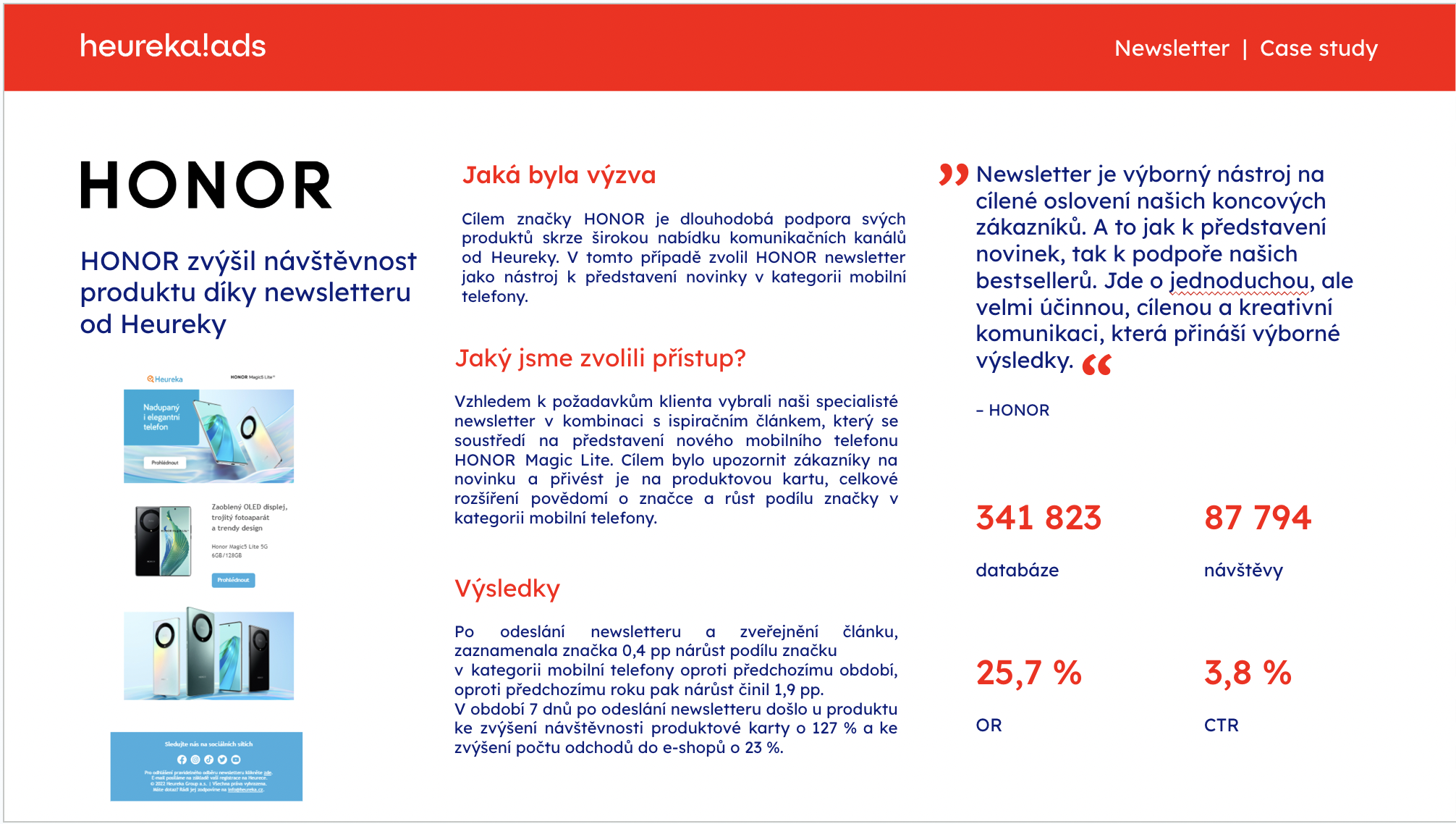 Návštěvnost produktové karty nového mobilního telefonu HONOR Magic5 Lite se zvýšila o 127 %, počty odchodů do e-shopu pak o 23 %. To všechno v období 7 dnů po odeslání newsletteru od Heureky se zmíněným telefonem v hlavní roli. Jak jsme těchto čísel dosáhli? Přečtěte i novou případovou studii a inspirujte se.